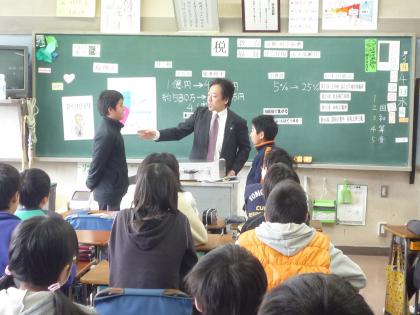 所得税の累進課税や、消費税について勉強しましたが、子どもたちもよく知っており、やる気いっぱいの活発な授業でした。