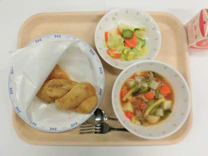 3/6(水) 本日の給食 公開日 2024/03/06 更新日 2024/03/06 給食 きなこ揚げパン 牛乳 フレンチサラダ ミネストローネ 主な食材と産地 ぶたにく 青森県 きゃべつ 愛知県 きゅうり 群馬県 にんじん 千葉県 たまねぎ 北海道 セロリ 福岡県 かぶ 千葉県