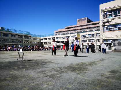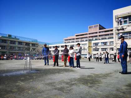 大地震及び火災を想定しての避難訓練を実施いたしました。玉川消防署用賀出張所の皆様にお越しいただき、消火器訓練も行いました。教員及び児童の代表が経験し、皆が応援しました。全員無事に的に噴射することができました。
