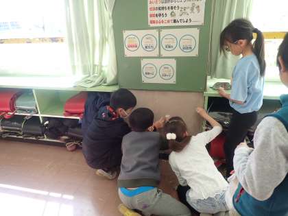 古い校舎をきれいにして大事に使うことは用賀小学校の伝統です。家から掃除用具を持参する児童もいました。