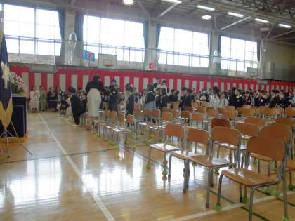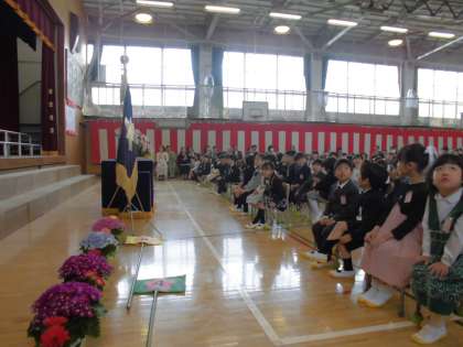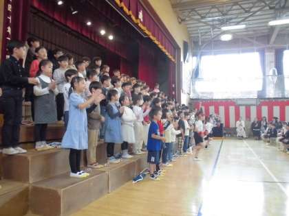始業式の後は、体育館に元気よく入場し、1年生の入学式を行いました。 2年生児童が歓迎の演奏などを披露しました。