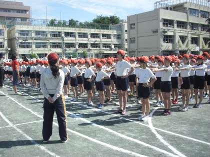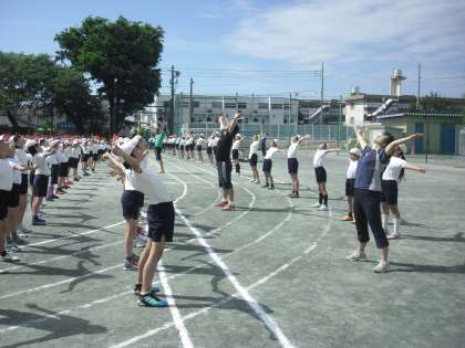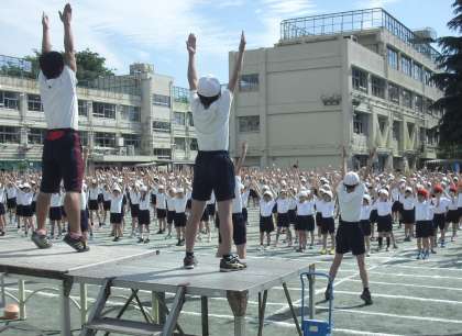 今日の体育朝会はラジオ体操の練習です。集合や整列のときの姿勢は背筋までぴんと伸びていてとても立派です。ラジオ体操は運動委員会の子どもたちがお手本となっての練習です。しっかり伸ばすところ、曲げるところなどを特に意識して練習をしました。26日の運動会に向けて今後も練習を重ねていきます。