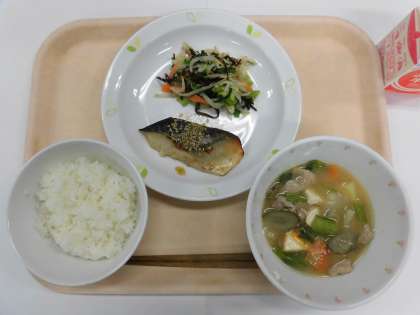 ごはん さばの七味焼き 野菜の塩昆布和え 豚汁 牛乳