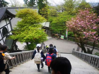 ケーブルカーの駅までを歩いています。お弁当を食べたので笑顔いっぱいです。