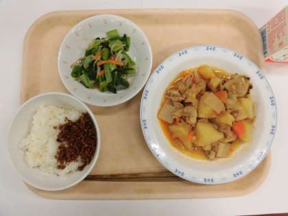 ごはん かつおでんぶ 韓国風ふりかけ 野菜のからしじょうゆあえ 牛乳