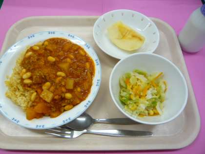 今日は、大豆の入ったチリビーンズライスでした。豆は苦手な児童が多いですが、今日のチリビーンズライスはよく食べてくれていました。