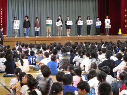 委員長さんから各委員会の活動内容について紹介してもらい、委員会メンバーを全校児童に紹介しました。