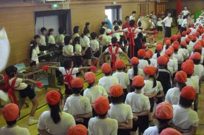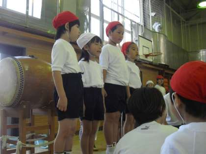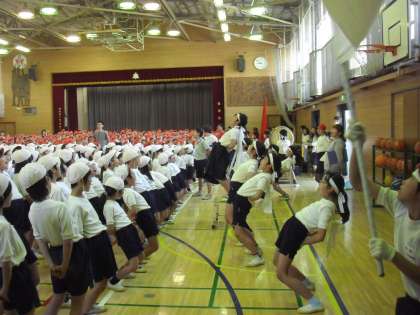 今日は運動会全体練習です。前日からの雨のため、先生達は早朝6時30分から、水を吸いとったり土を入れたりと整備をしたのですが、使用できる状態にまではいかず体育館での練習となりました。その場での入場行進から開会式の練習をしました。『いつでも本気』の用賀小学校ですから、1年生代表児童による「はじめのことば」、5・6年生の応援団を中心とする応援合戦の練習も気合いが全開です。本番さながらで見ていてもとっても気持ちがよかったです。