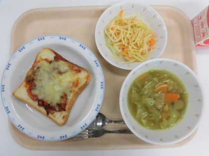 ピザトースト じゃがいものハニーサラダ 野菜のカレースープ 牛乳