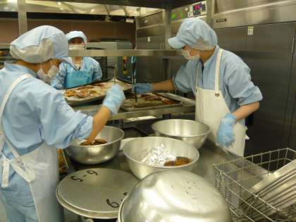 給食では、衛生的に作業をするために作業ごとにエプロンをかえています。例えば今日の「さばの梅みそ焼き」では、魚を鉄板に並べるときはピンク、焼くときは水色、焼いた魚を各クラスの食缶に配缶するときは白のエプロンを使いました。