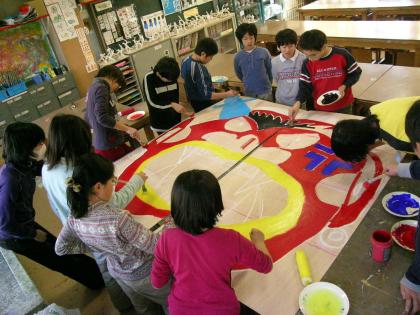 2月3日(日)は節分です。2月1日〈金)の節分集会では、各クラスの「追い出したい鬼」を発表します。「鬼は外。福は内」だけでなく、各地の豆まきの言葉も紹介されます。今年は、「豆まきをした〜い」という集会委員のメンバーの強い希望から、豆まきを実現することになりました。とはいっても、体育館で全校児童で豆をまくのは無理!そこで、考えたのは、大きな鬼(ベニヤ板2枚分)の顔の口に玉入れの玉を投げ入れて、鬼をやつけることにしました。写真は、集会委員会で大きな鬼の顔を作っているところです。さて、用賀小の子どもたちは、各クラスの鬼を退治することが出来るでしょうか?