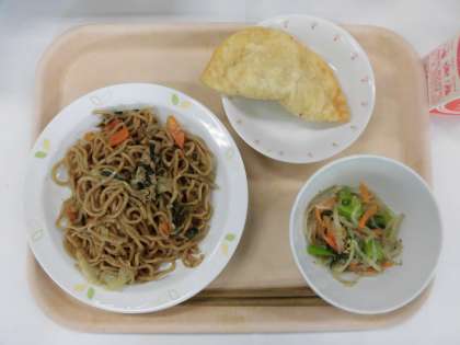 ソース焼きそば ツナとポテトのパリッと揚げ 塩ナムル 牛乳