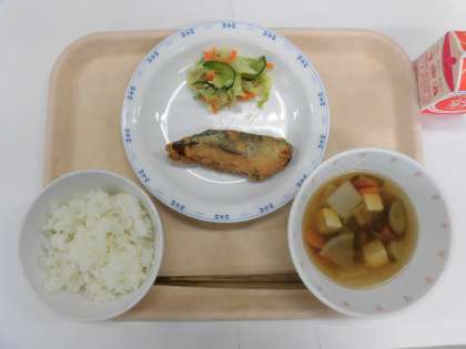 ごはん さばの竜田揚げ 野菜のみそドレッシングサラダ けんちん汁 牛乳