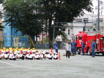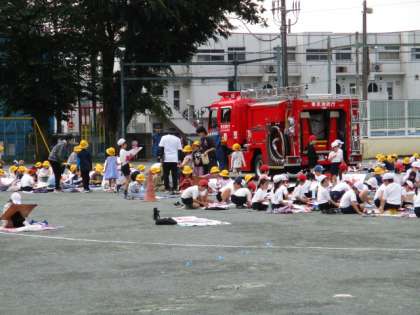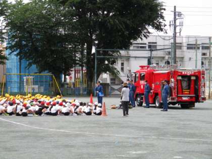 消防自動車を校庭に迎えて、写生会をしました〜 大きな働く車を近くでしっかり見て描いていましたね・・・