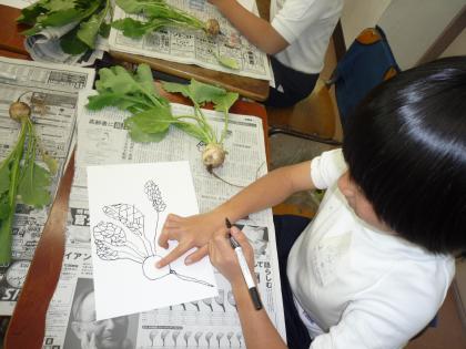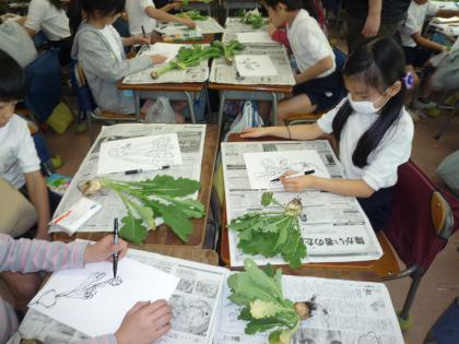 3/10 畑で取れたかぶと大根 公開日 2009/03/11 更新日 2009/03/11 校長室より 用賀小学校の2年生は、学校のすぐ裏手にある区民農園で野菜の栽培をしています。夏には、なすやトマトがたくさんとれました。秋冬の作物は、小松菜、大根、かぶなどです。今日はかぶと大根を収穫して絵に描いて観察です。 大根の蒔きどきが1ヶ月くらい遅れてしまったので、葉は立派ですがかんじんの大根は・・・小さめになってしまいました。植物の育ちは微妙です。 でも子どもたちは大喜びでした。
