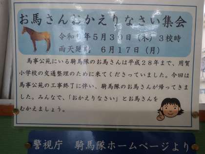 明日は「お馬さんお帰りなさい集会」です。 公開日 2024/05/29 更新日 2024/05/29 今日のできごと 明日は騎馬隊のお馬さんが8年ぶりに用賀小学校に来ます。児童も保護者も地域の方も皆が楽しみにしています。