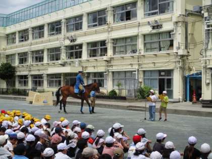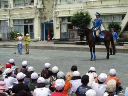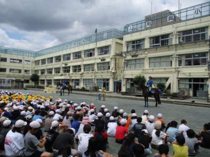 お馬さん、おかえりなさい集会では、騎馬隊のお馬さんと用賀小学校とのふれあいの歴史などについて子どもたちが調べ、発表しました〜