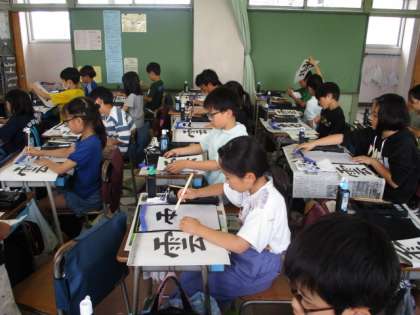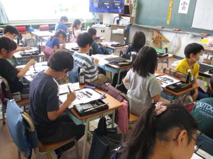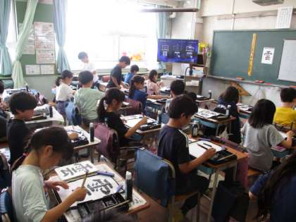 毛筆習字の学習です。 お手本をよく見て、運筆、筆遣いに気を付けながら練習しました〜
