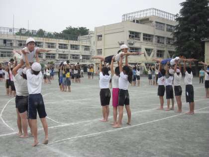 運動会通し練習は後半戦4〜6年生です。下級生の憧れである6年生の「組体操」は、張りつめた空気の中での練習です。手の指先、足のつま先までぴんと伸びている姿勢一つをとってもなかなかできるものではありません。技も難易度も高く、一人一人の気持ちが一つにならなければできないものばかりです。高いレベルの組体操に取り組んでいますので子どもも教師も常に真剣です。