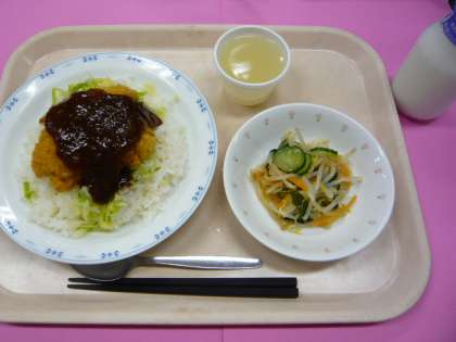 今日は、運動会応援メニューで、「ソースカツ丼」を出しました。また、サラダのドレッシングにも、疲れをとる働きがある梅干しを入れました。明日の運動会は、頑張って欲しいです。