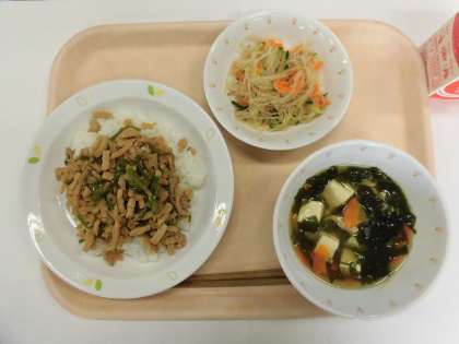高野豆腐のチンジャオロース丼 春雨サラダ わかめスープ 牛乳