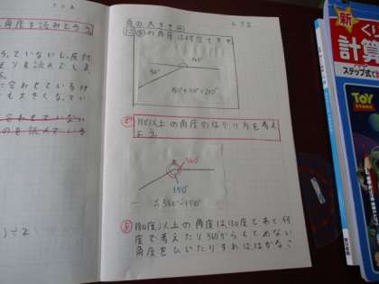角の大きさ〜4年 公開日 2024/06/07 更新日 2024/06/07 今日のできごと 角度の単位や、分度器を使った角度の測り方について学習した4年生・・・ 180度より大きい角度の測定の仕方を考える学習です。 180度や360度の角に着目し、180度とあと何度に分けて考える作戦、360度から余分な角度を引く作戦などで問題解決をしていきました〜