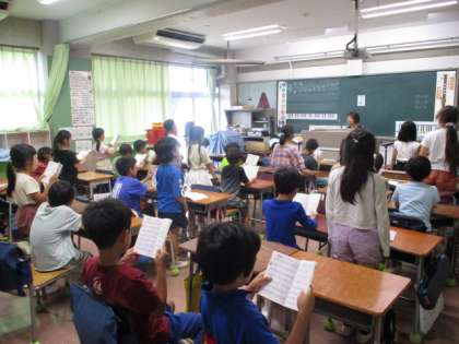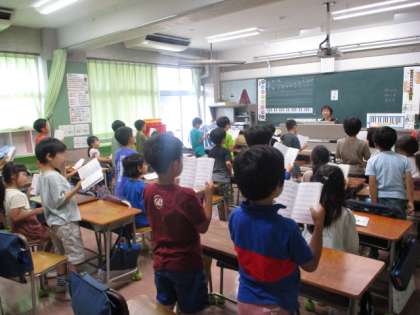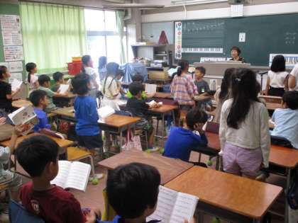 音楽の学習です。 戦士絵の伴奏に合わせ、曲想を感じ取りながらみんなで歌いました〜