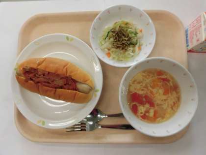 セルフウインナーサンド ごぼうチップサラダ たまごとトマトのスープ 牛乳