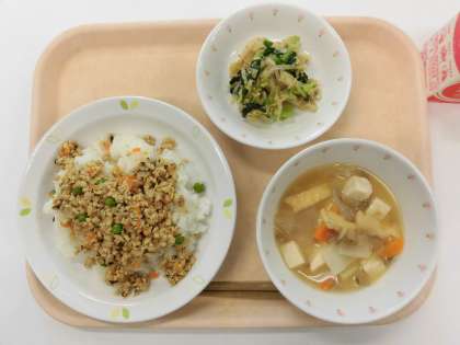 凍り豆腐入りそぼろごはん 野菜のごまだれかけ 呉汁 牛乳