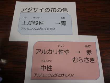 土の性質、日本が火山が噴火してできた大陸で酸性の土壌が多いこと、日本は雨が多く降ることなどもアジサイの花の色に関係があることを紹介しました。