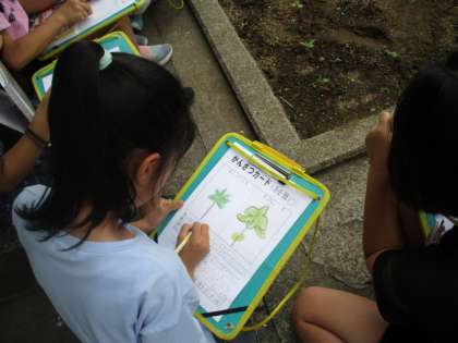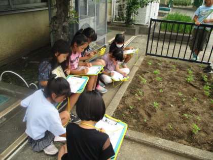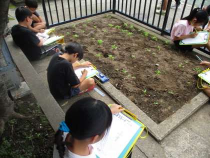 理科の学習です。 3年生が育てているホウセンカやヒマワリの苗の育ちの観察記録に取り組んでいました〜