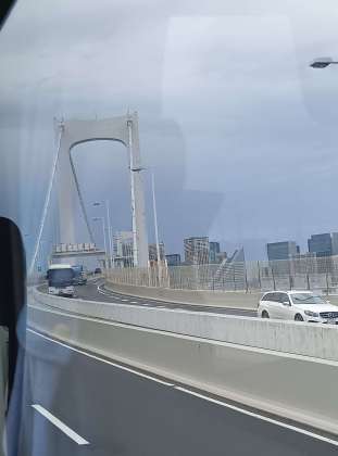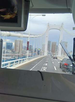 レインボーブリッジをわたりました。 今現在、道路も順調に流れています。予定より早く学校に戻れそうです。