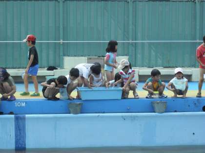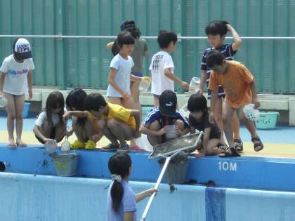 今日は2年生が、水泳授業の前に「ヤゴ救出大作戦」と名付け、ヤゴとりをしました。子どもたちの安全を考慮し、教師がプールに入り、すくった水を大きなバケツに入れ、そのバケツから子どもたちは小さな網でヤゴをすくいました。思ったよりもたくさんのヤゴがとれたので大喜びです。これから赤虫を餌にして、トンボになるまで育てます。いつごろ羽化するのかが楽しみです。なお、プール及びプールサイドの放射線量は3日間に渡り計測をし、人体には影響のない数値であることを確認して実施しております。