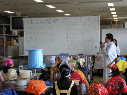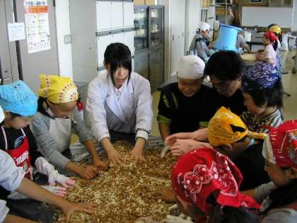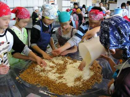 4年生の味噌づくりも、その一貫です。毎年、古庄先生と舘先生のご指導で100キロ近いお味噌を仕込みます。初めの頃は、学校の家庭科室で学習していたのですが、今は、農大の実習室での学習です。多くの学生さんがたにもお世話になっています。