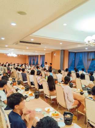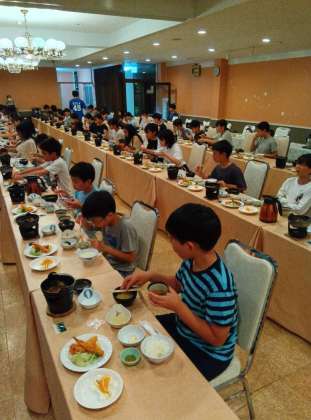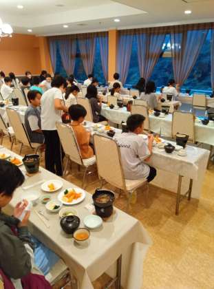 食堂で夕食です。 食事係が、今日の活動を振り返って、一句を発表しました〜 みんなで美味しくいただいています〜