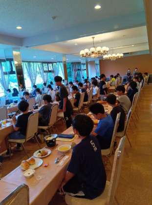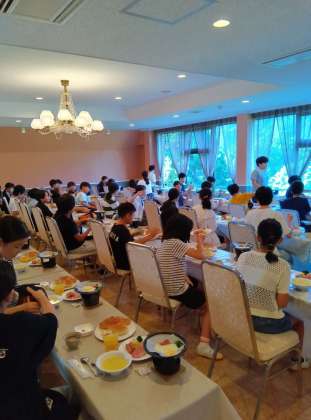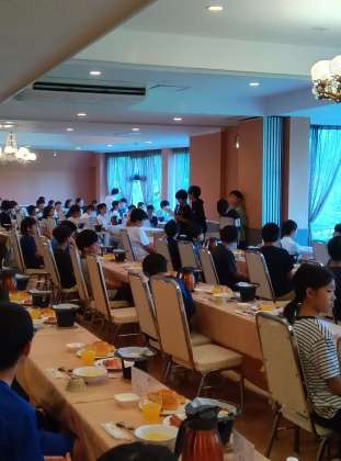 朝会を行い、宿舎での最後の朝食です。担当児童が日光での一句を披露し朝食をいただきました〜