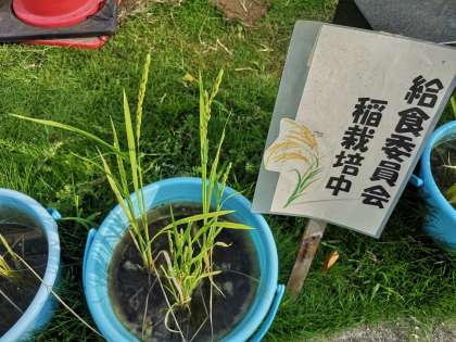 給食委員会が稲を栽培しています。「出穂」「開花」を経たところです。籾の中にお米が実りますように・・・