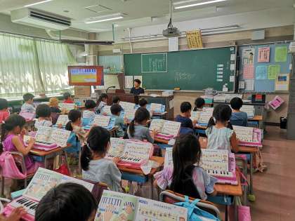 鍵盤ハーモニカの基本的な演奏の仕方を学んでいます。学級担任の伴奏に児童全員の音が重なり、心地よい雰囲気でした。息遣いもちょうどよく、よい音色です。