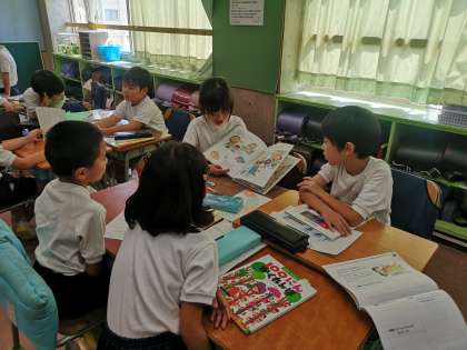 自分が選んだ本について、友達に紹介をしています。「誰から紹介する〜?」「じゃあ、私から・・・」グループの中で様々なやりとりをしながら進めています。どのグループも友達に体を向けて、のめり込んで聴いています。
