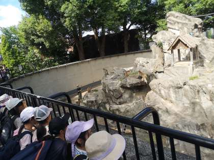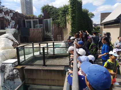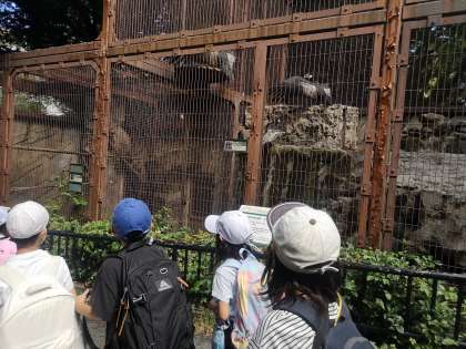 上野動物園 2年 公開日 2024/09/26 更新日 2024/09/26 今日のできごと ゾウさん、トラさん、ハゲタカさん、シロクマさん等 見ながら歩いています。今日は暑いので室内にいる動物さんもいます。「(シロクマさんを見て)大き〜い」「あっいたいた!」「(ニホンザルさん)お尻を向けているよ」「(ハゲタカさんが羽根を広げているのを見て)威嚇しているよ」「(ツルさんを見て)あの茂みの中にいるよ」子どもたちの言葉を聞いているのも楽しいです。