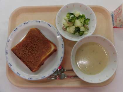 きなこバタートースト ウインナーと野菜のソテー コーンポタージュ 牛乳