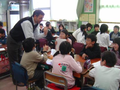 5年生は英語の学習を行いました。アメリカ人のブライアン・バード先生に単語や簡単な会話を教えていただきました。はじめは緊張気味だった子どもたちも段々と笑顔で会話ができるようになりました。