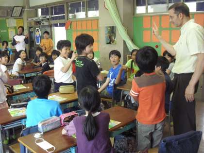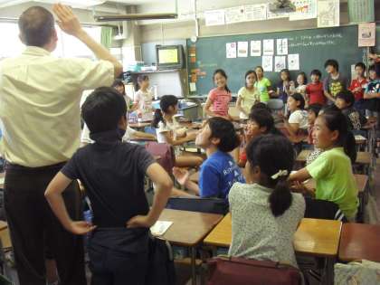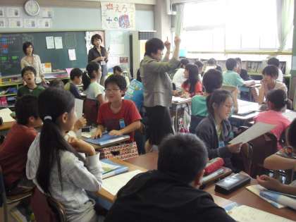 用賀小学校では平成22年度より、年間35時間の英語活動を実施してきましたが、今年度は本格実施2年目の年です。もちろん指導者は担任教師ですが、十分な指導力をつけるためには、継続的な勉強が必要です。そのために、数年前から研修を繰り返してきましたが、今年も年間5時間をブライアン・バード先生と藤原先生にご指導いただいています。担任教師は両先生と授業を共にしながら、授業の方法等を研修しています。夏季休業中には、特別に時間をとっての研修を行います。