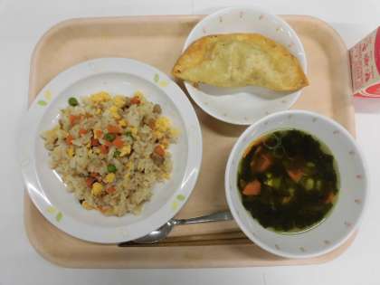 たまごチャーハン ジャンボ揚げぎょうざ わかめスープ 牛乳