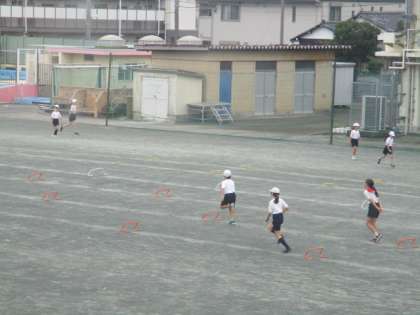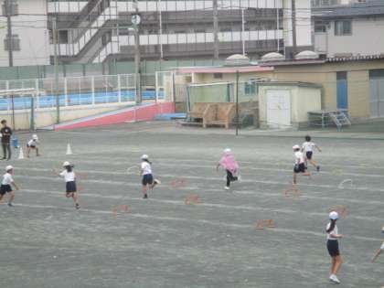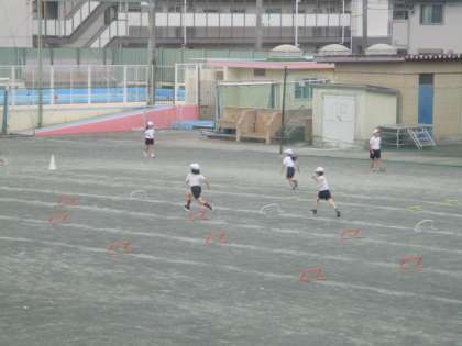 中学年の走・跳の運動です。 小型ハードルを自己に合ったリズムで走り超える学習に取り組んでいました〜