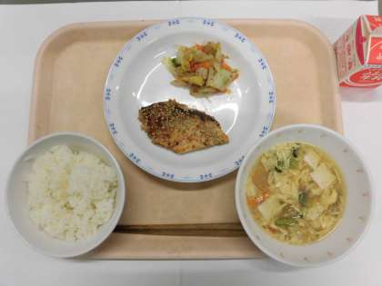 ごはん さばのごまみそ焼き 白菜のおかかかけ かきたま汁 牛乳