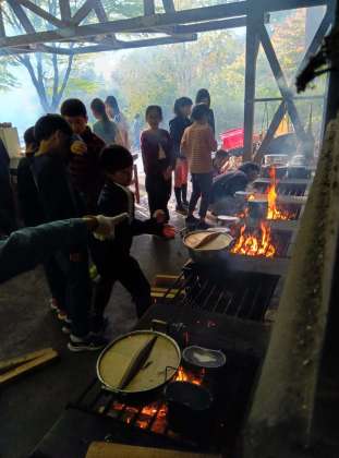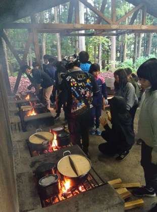 かまどに火を入れて、カレーづくりが進んでいます〜