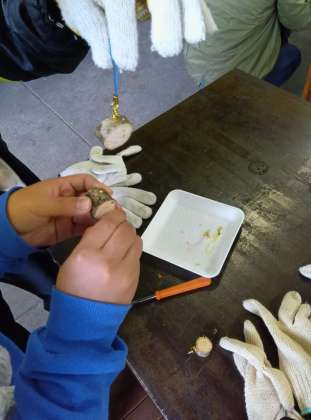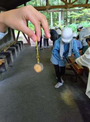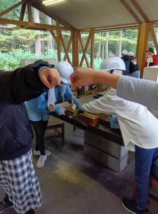 林業体験、、のこぎりを使って木を切る体験、小さな木でストラップを作りました〜