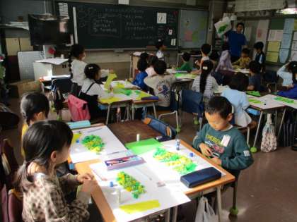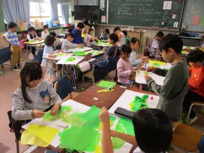 お話に出てくるあおむしを作る活動です。 葉っぱも工夫して作りました〜