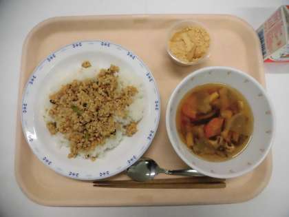 高野豆腐のそぼろ丼 ぬっぺ汁 おもち 牛乳
